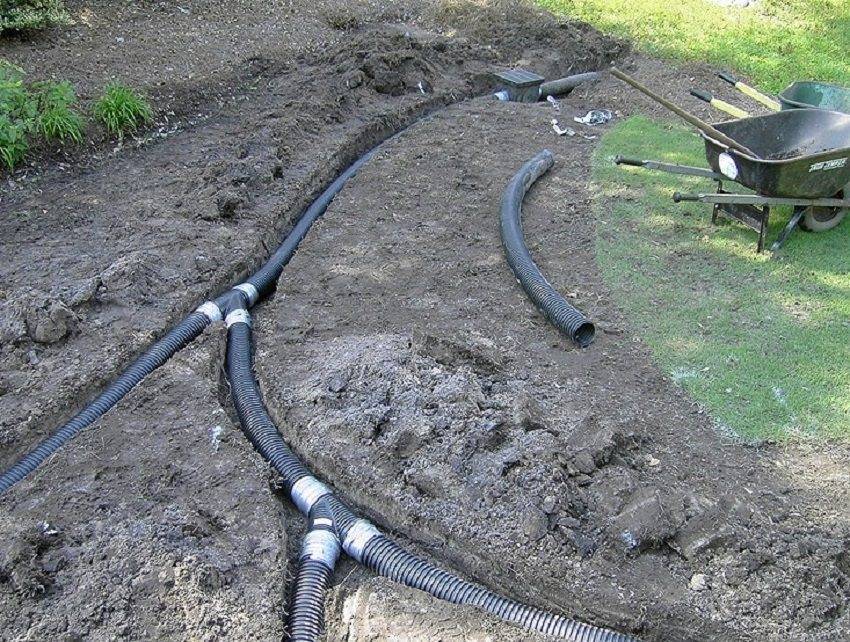 - Засыпав и утрамбовав песок на дне траншей, укладывают в намеченных местах трубы и лотки.
