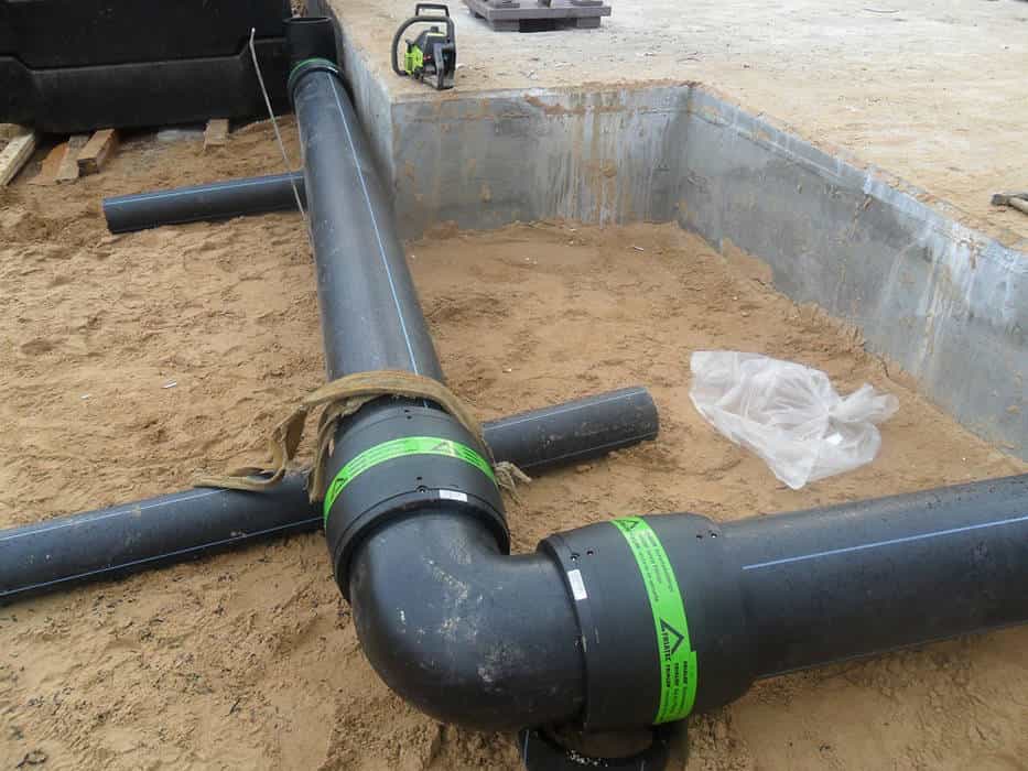 Далее следует укладка труб и соединение секций между собой. Делается это методом сварки или стыковки. С помощью фурнитуры соединение заделывают паклей и смолой. Полимеры могут сжиматься и расширяться под воздействием температур, вызывая утечки. Устранить их в земле будет сложно.