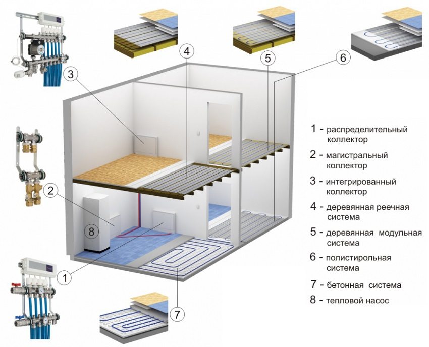 - Подогрев пола — основной вид отопления. Именно он дает основное тепло. Возможно, есть другие источники тепла, но они больше как резерв — на случай слишком холодных дней. Такой тип называют теплый пол.