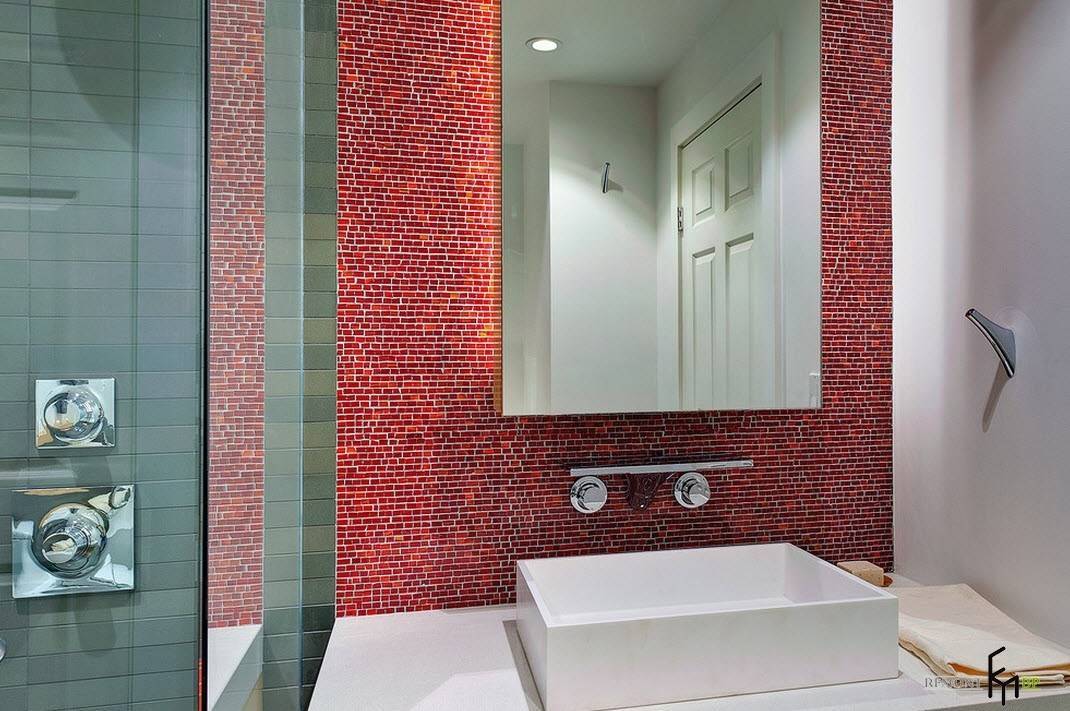 Существует много дизайнерских решений выделения зон в ванной. Здесь можно проявить свое творчество и сделать неповторимый стиль. Так зеркало на стене выделить при помощи смальт мозаики.