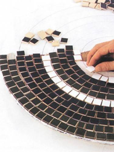Когда загрунтованная поверхность обсохла и эскиз перенесен, приступают непосредственно к укладыванию мозаичных элементов. Работать начинают от центра или с края. Чаще всего сначала выкладывают центральное изображение, а фон оставляют на потом.