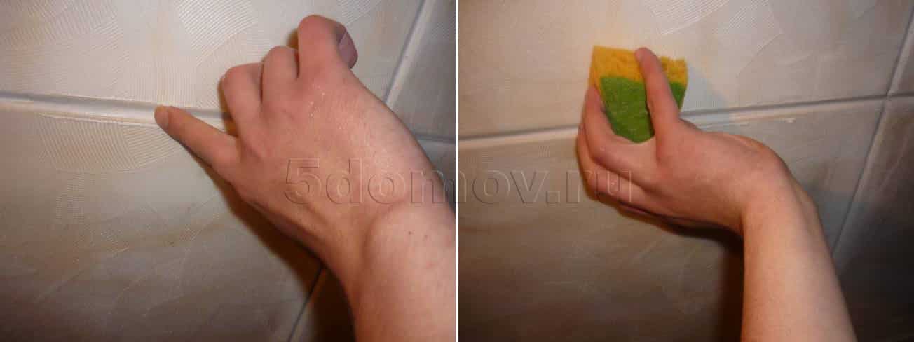 При отделке старой плитки с желтизной и налетом грязи (это часто встречается на кухонных потолках) ее необходимо предварительно помыть, используя губку. Далее проводится осмотр на предмет вывалившихся стыков: если таковые имеются, их необходимо заделать.