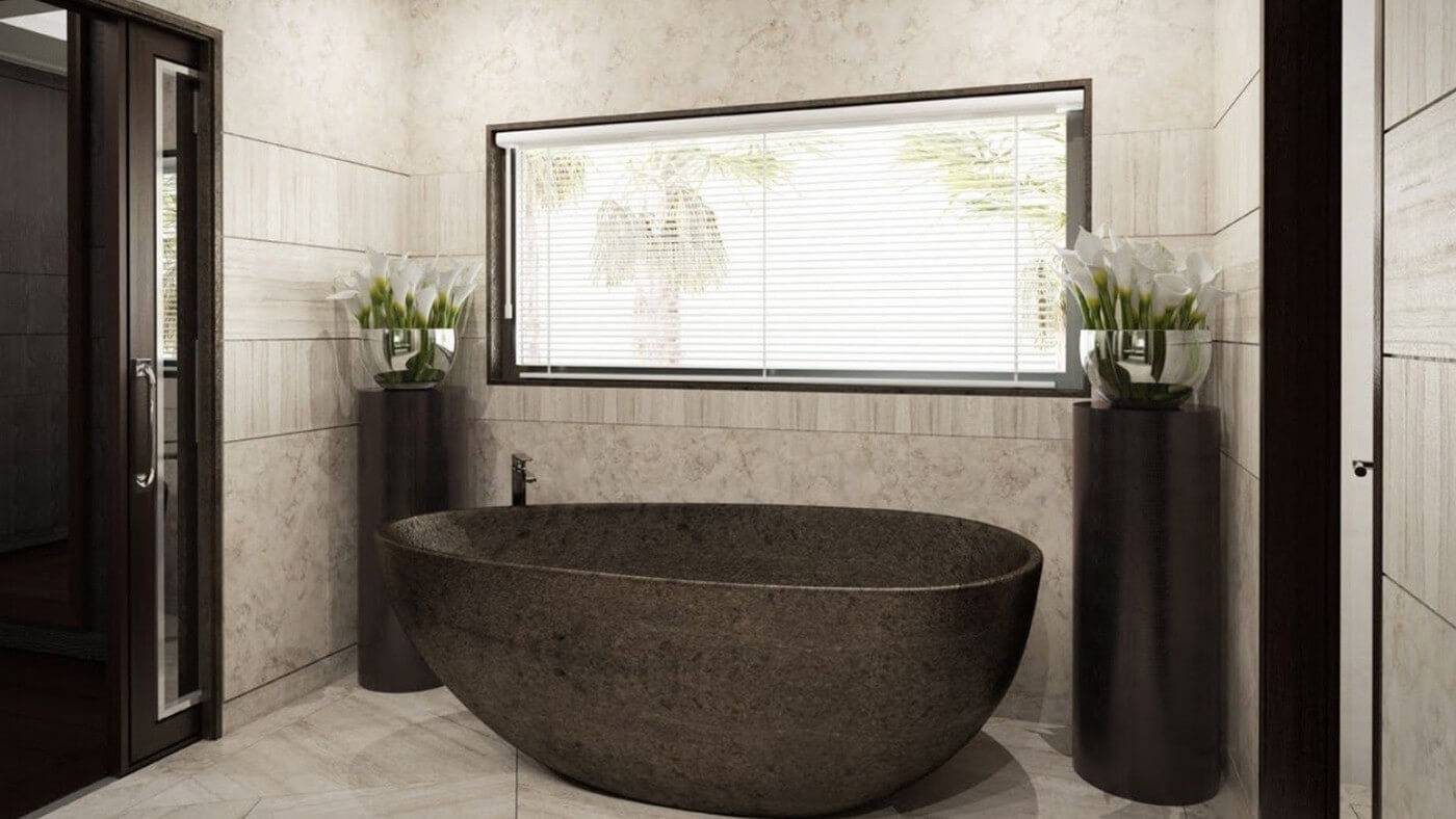 В этом современном минималистичном интерьере в серых тонах столешница из чёрного мрамора моментально притягивает внимание наравне с каменной чашей ванны