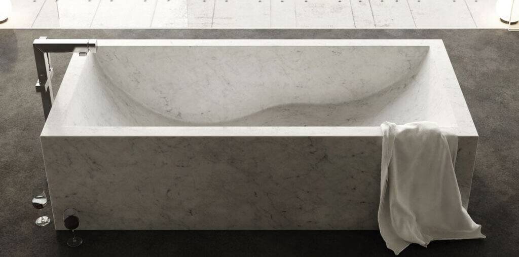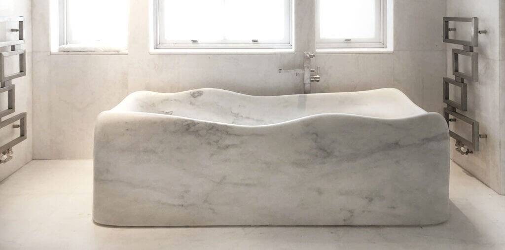 Для мраморной ванной подойдет твердый кальцит, имеющий живописные прожилки и кристаллическую структуру. Популярен среди видов одежды, используемых с древних времен. Его природные запасы почти исчерпаны, но производители производят красивую имитацию, создавая любой рисунок, при этом богатую палитру оттенков с эффектом натурального камня. Высоко ценятся серо-белые экземпляры, разбавленные темными прожилками. Натуральный материал со временем изнашивается под подошвой.