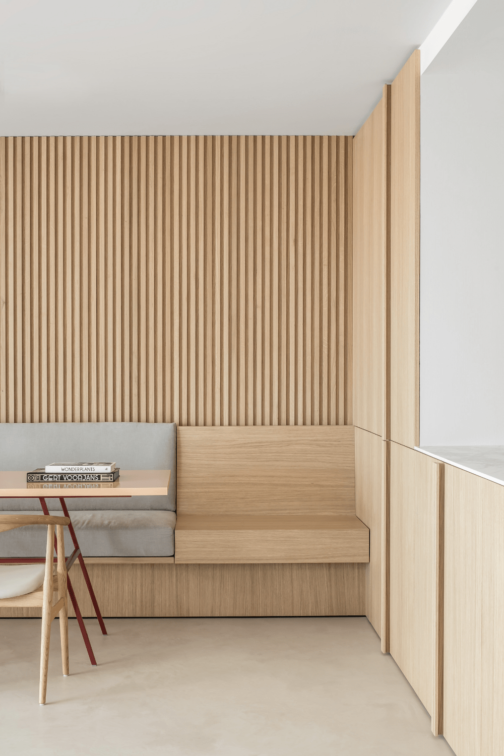 - Кухня. Рядом с настенным вариантом декоративных реек можно разместить обеденный стол. На ламелях желательно закрепить светильники или различные декоративные аксессуары. Подсветка может быть встроенной и плавно переходить на потолок.
