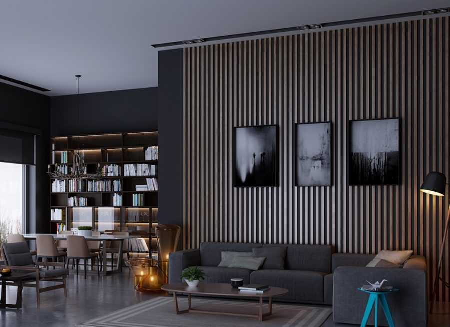 - Гостиная. Изделие может располагаться у стены или отгораживать какую-либо зону комнаты. Особо хорошо оно сочетается с мягкой мебелью. Если реечное оформление находится за диваном, на нем интересно будут смотреться картины и прочие декоративные аксессуары. Перед диваном сооружение устанавливается для размещения телевизора и полок.