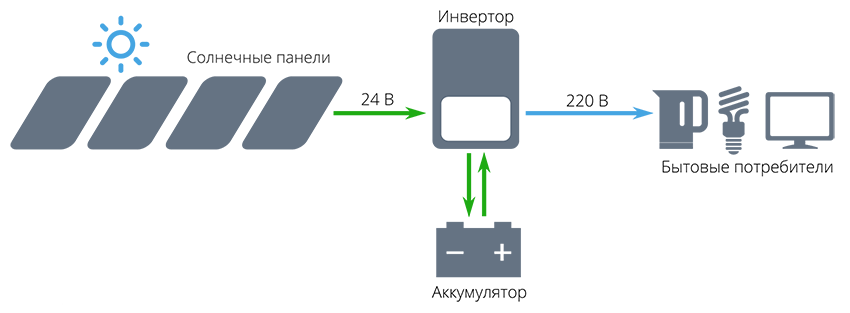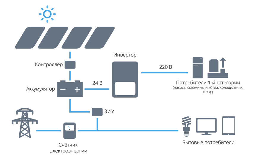 В состав входят, кроме солнечных панелей, накопительные аккумуляторы, что позволяет создать полностью независимую от внешних источников систему электроснабжения. Существенный минус такой станции, — её высокая стоимость, на две трети зависящая от количества накопителей электрической энергии.