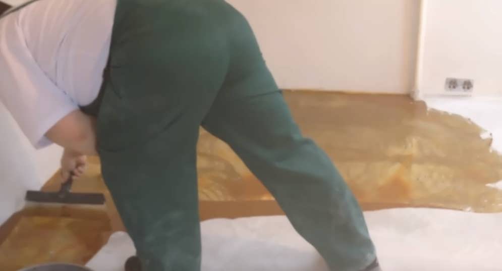 Смесь следует смешать при необходимости с отвердителем, вылить на пол и аккуратно распределить по всей поверхности раклей или шпателем. Далее производится деаэрация – удаление пузырьков воздуха игольчатым валиком.