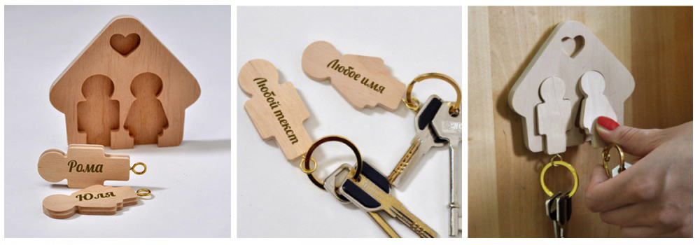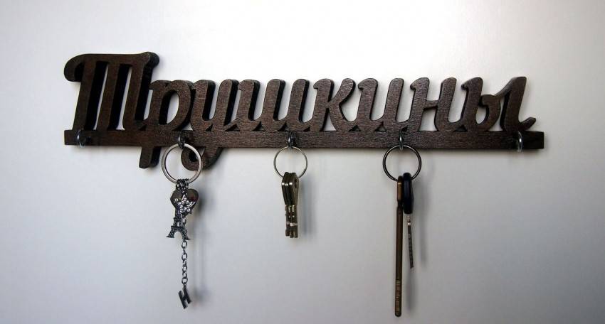 У многих пользуется популярностью ключница, вырезанная в форме домика, с отдельно выпиленными человеческими фигурками, которые являются брелоками. По приходу близких домой, пустоты в домике заполняются и видно кто есть в квартире, а кто отсутствует.