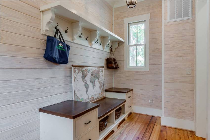 В ситуации, когда пространство ограничено и каждый сантиметр находится на счету, можно украсить прихожую обыкновенной и маленькой вешалкой, которая представляет собой ряд крючков и небольшую полку-скамейку. Нижнюю полку можно использовать в качестве ниши для хранения вещей или оставить ее открытой и сберегать там повседневную обувь. Такая настенная вешалка с обувницей в прихожую не займет много места, но освободит пространство от хаотично расставленной обуви в небольшом помещении.