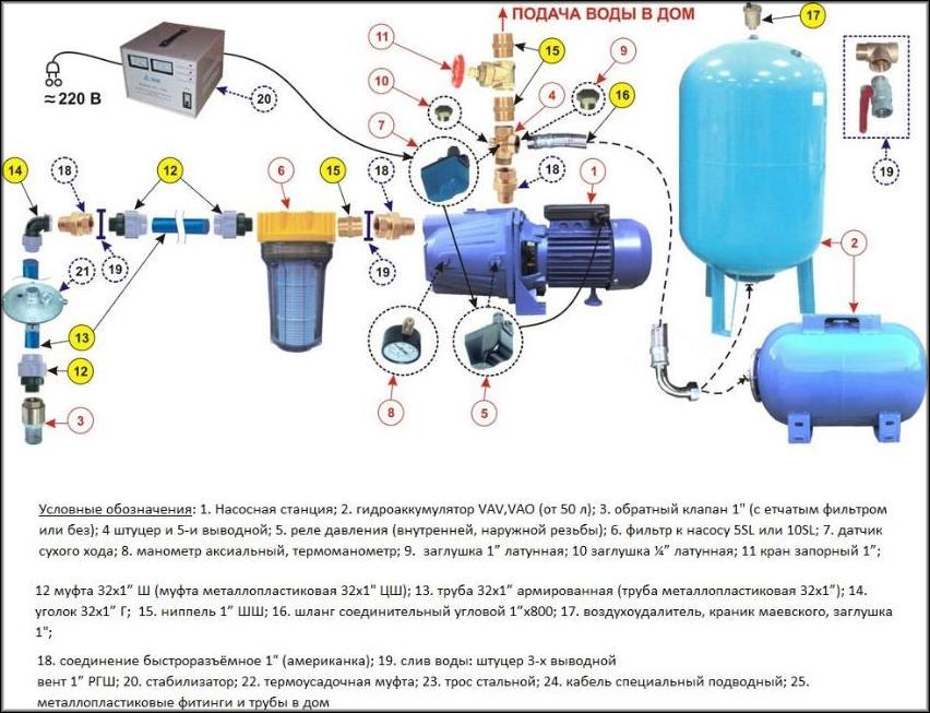 Если помпа поверхностная (насосная станция), то контроллер ставят параллельно с гидробаком и насосом (как на второй картинке снизу), то есть все эти приборы присоединяются к своим выходам на 5-выводном штуцере.
