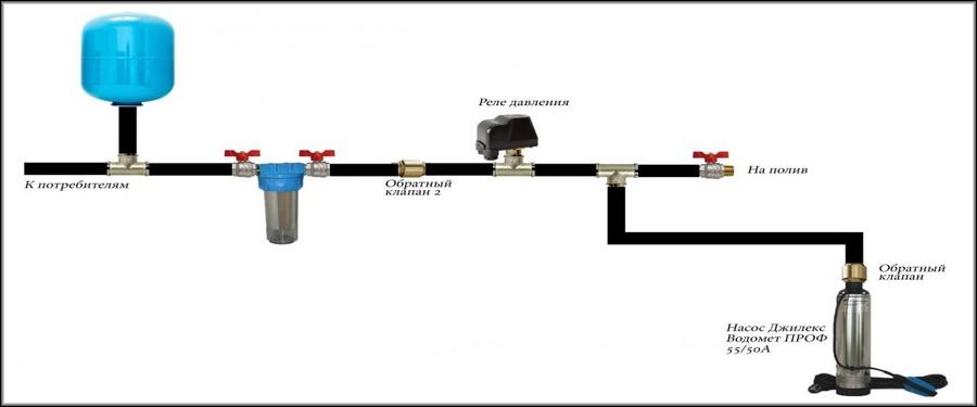 Схема подключения реле давления при погружном насосе в скважине, если смотреть в сторону потребителя: реле ставят на линии расхода на отводе для гидроаккумулятора или на тройнике перед ним.