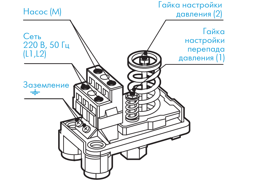 Подсоединяя реле, что отвечает за регулирование давления, важно осмотреть все метки. Под крышкой располагаются контактные соединения – «сеть» и «насос». Следует не путать провода
