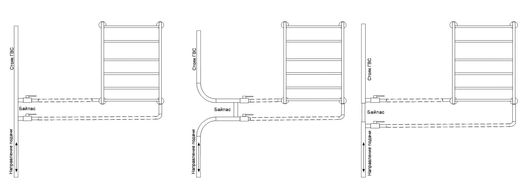 Работа полотенцесушителей с нижней подводкой очень сильно зависит от давления и направления подачи теплоносителя, поэтому используется несколько схем подключения — с прямым, смещённым или зауженным байпасом