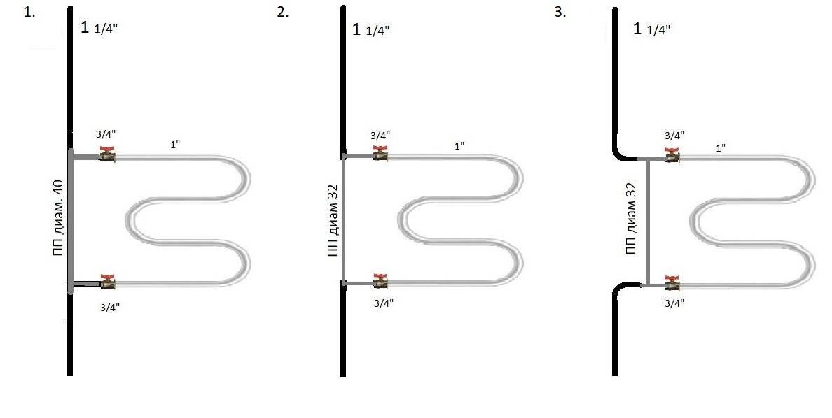 Патрубки к ПС чаще всего меньшего диаметра, но обычно только на одну ступень. Тогда горячая вода легко преодолевает сопротивление и происходит нормальная циркуляция. При слишком малом диаметре патрубка жидкость пойдет по пути наименьшего сопротивления, т. е. мимо контура с полотенцесушителем.