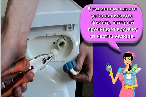 - Прочистить фильтр-сеточку, расположенный там, где в стиральную машину входит вода.