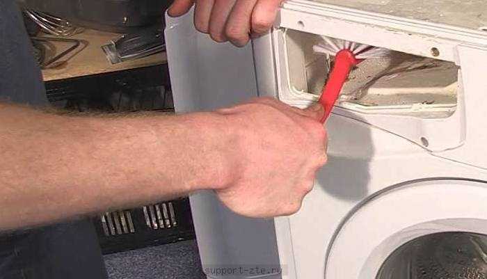 - Сложность заключается в том, что нужно отсоединять все панели, дозатор для порошка, вынимать хомут и манжет дверцы, вытаскивать блокиратор.