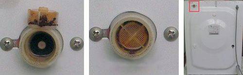 Фильтр, очищающий поступающую в систему воду, находится в задней части устройства, преимущественно с правой стороны – такое конструкционное решение характерно для многих современных моделей. Это достаточно простой элемент, состоящий из крышки и сетки, которая и играет роль фильтра. Учитывая тот факт, что в отечественных трубопроводах качество воды оставляет желать лучшего, нет ничего странного в том, что такой фильтр очень часто засоряется. Периодически его нужно чистить. Если этого не делать, то изначально упадет напор воды, а далее ее подача прекратится совсем.