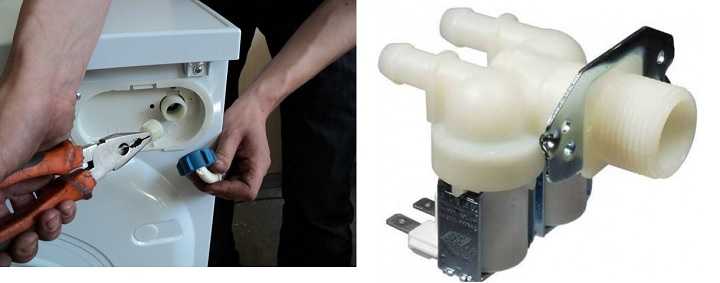 Дефект впускного клапана. То, что с элементом что-то не так, можно заметить еще до выхода машинки из строя. На начальном этапе порошок из кюветки будет вымываться не полностью – это и есть тревожный «признак» повреждения клапана. Чтобы проверить его работоспособность, следует подать на электромагнитный клапан 220 Вольт. Если элемент замкнется (об этом уведомит характерный щелчок), значит, все работает