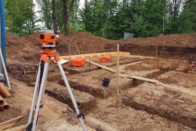 Как и в случае с обычным малозаглубленным фундаментом, работы по технологии с несъемной опалубкой начинаются с подготовки строительной площадки. Её очищают от пней, кустарников, мусора, при необходимости устраивают дренаж для отвода грунтовых вод, подъездные пути и место для складирования материалов.