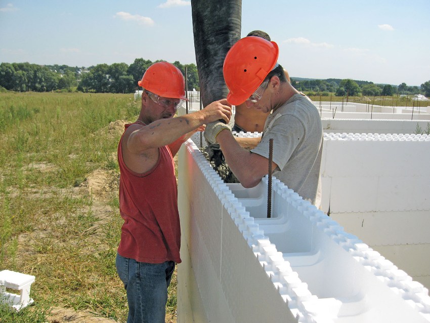 В отличие от профильных плит при установке блоков и панелей из пенополистирола не требуются подъёмный кран и сварка арматурного каркаса. Их легко собирают вручную по принципу конструктора, без использования клеевых или герметизирующих составов (паз-гребень) либо на тонкий слой раствора или клея (1-3 мм).