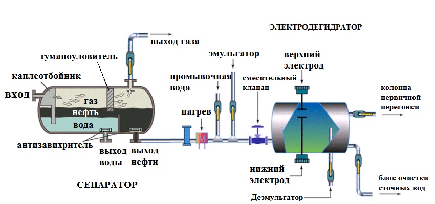Сырая нефть с растворенными в ней газами, водой и солями поступает в сепаратор. На входе в сепаратор установлен каплеотбойник для предотвращения уноса жидких продуктов с газовой фазой. В сепараторе из нефти отделяется нерастворенная вода, а также легкие углеводороды, которые проходят через туманоуловитель для предотвращения уноса жидкой фазы и выходят с верха сепаратора. Сепаратор оснащен антизавихрителями в местах отбора жидкой фазы: воды и сырой нефти.