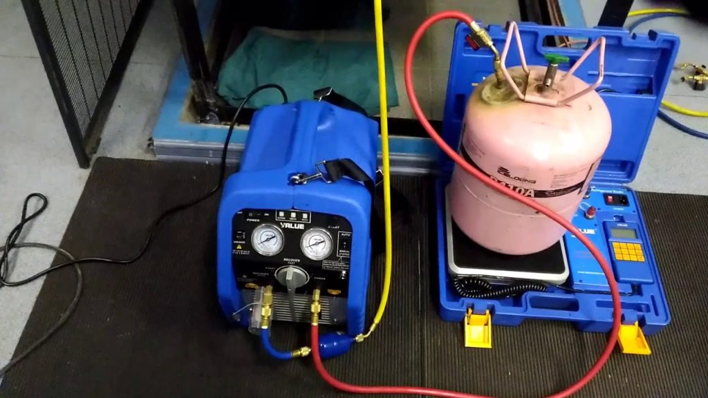 - устройство извлечения хладагента – откачка холодильного вещества в резервуары (отдельная ёмкость для каждой марки) с последующей сдачей на переработку; при наличии функции регенерации можно перерабатывать использованный газ сразу при заборе из кондиционера;