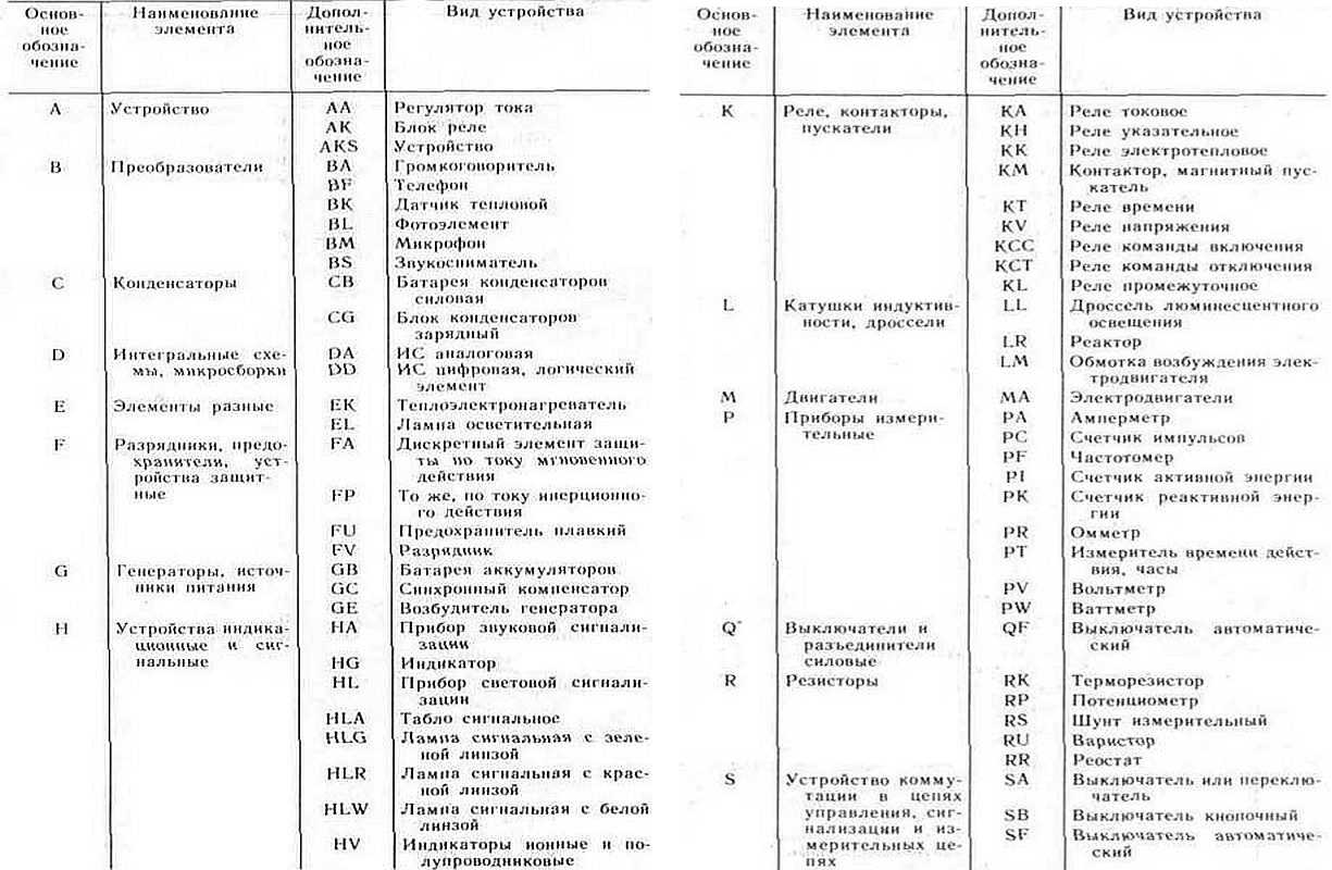 Буквами на электросхемах и чертежах маркируют радиоэлементы, электронные детали, интегральные микросхемы, электродвигатели и прочее. Примерный перечень буквенной маркировки представлен нижеследующим списком.