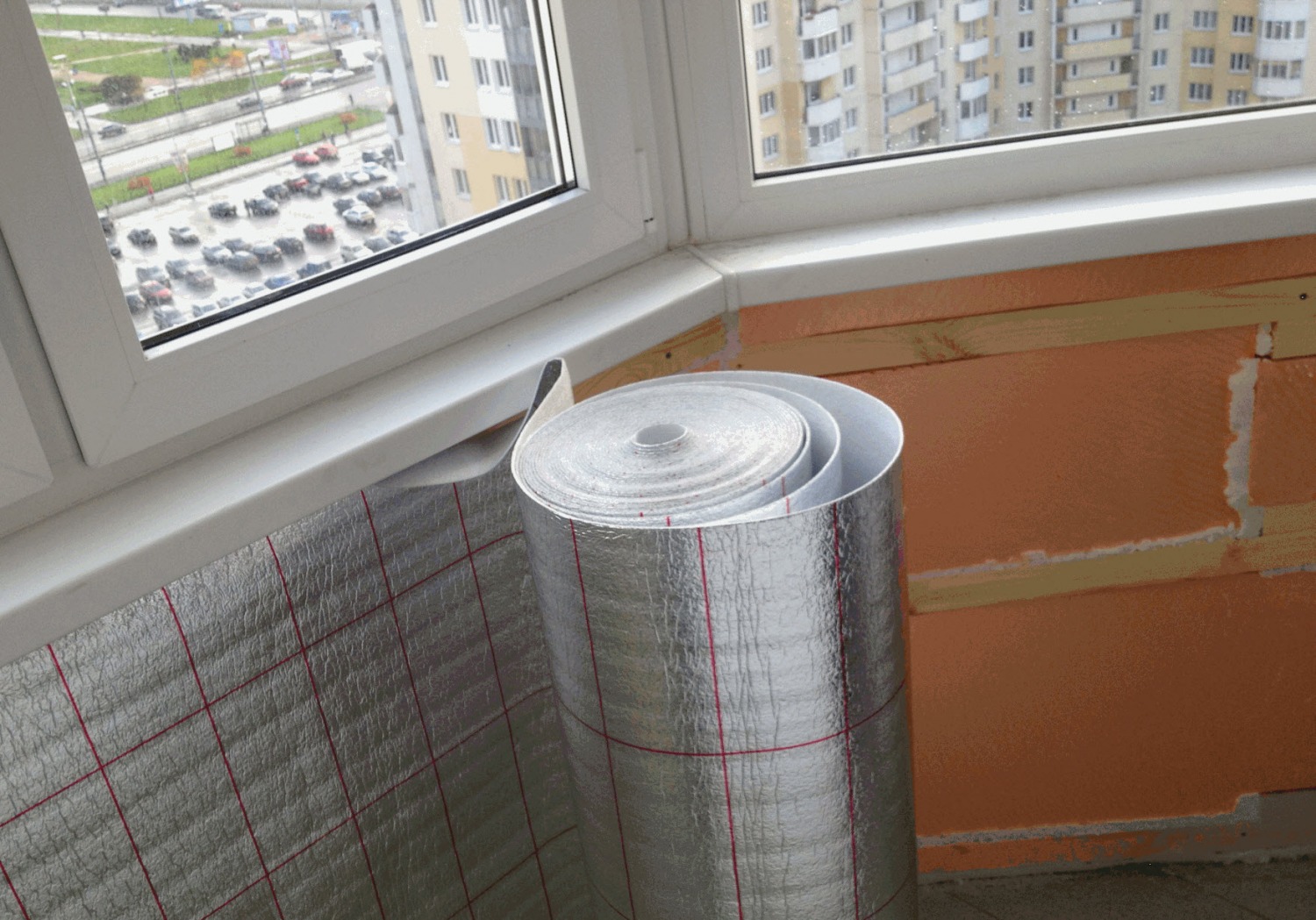 - Следующий этап: протянуть фольгированный материал такой как пенофол или изолон. После утепления необходимо завершить утепление, закрыв парапет специальной пленкой, которая не допустит попадание конденсата. На этом внутренняя отделка завершена и сейчас вам необходимо перейти к внешней отделке.