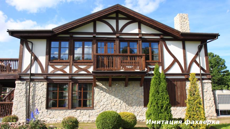 Совершенно другой вид приобретает дом, если добавить не резных, а строгих, прямых элементов – к примеру, балки для ограждений крыльца и балконов. Они могут придать дому японский или скандинавский колорит. Крашеные облицовочные панели, «разбавленные» тонированными деревянными рейками, создадут стиль фахверк. Настоящая фахверковая конструкция предполагает открытые балки – рейки только имитируют стиль.