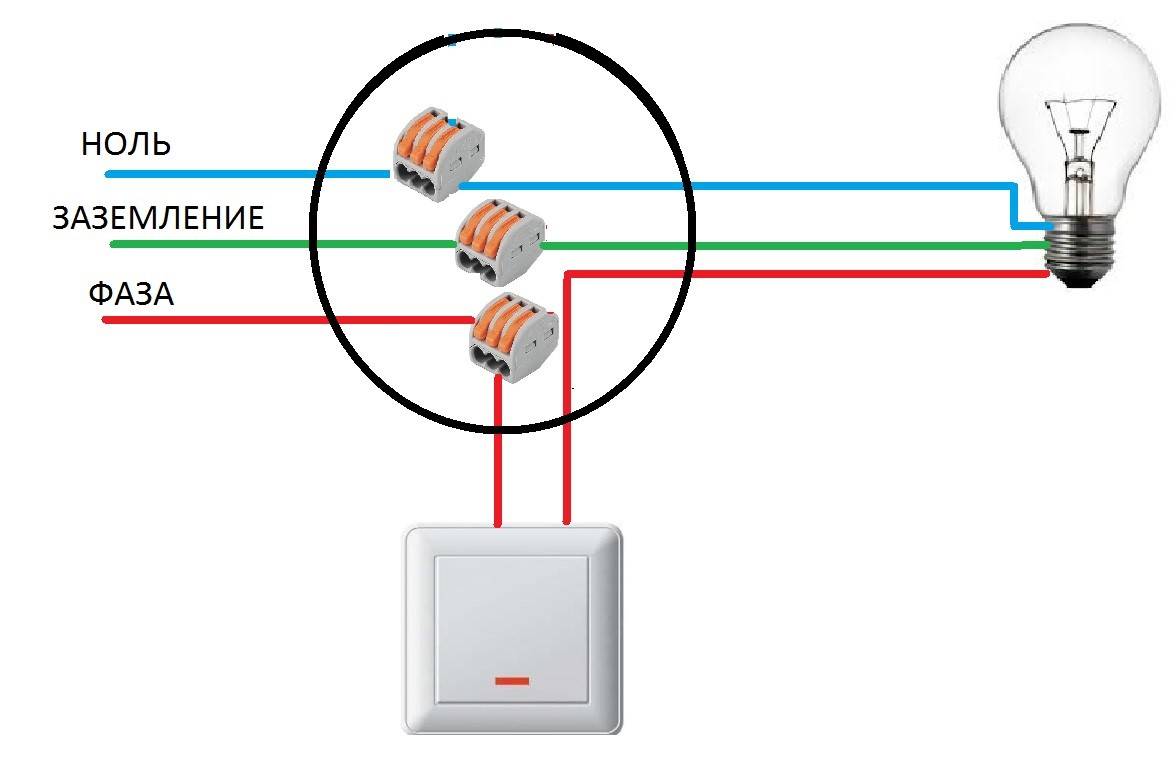 Провод, который выходит с одноклавишного выключателя соединяется с фазным проводником светильника.