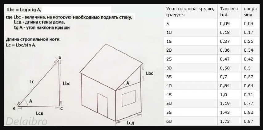 Для выяснения высоты балки (стропила) можно опираться на известный уже угол наклона и расчетную длину, которая определяется по тригонометрическим формулам.