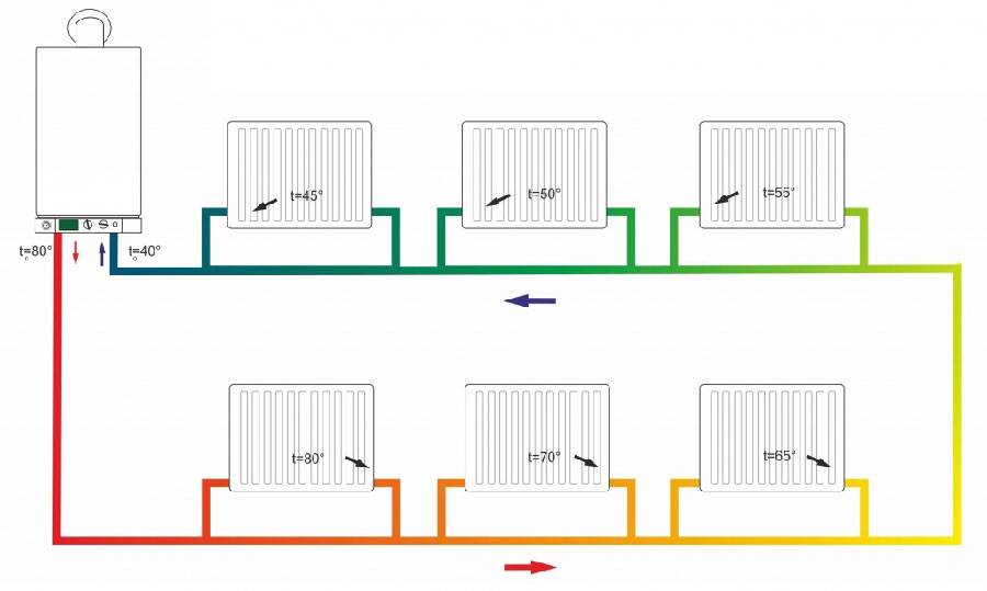 - в первом радиаторе температура будет выше всего, а в последующих она будет более низкой из-за постоянного подмеса к потоку теплоносителя из радиаторов, которые уже были пройдены;