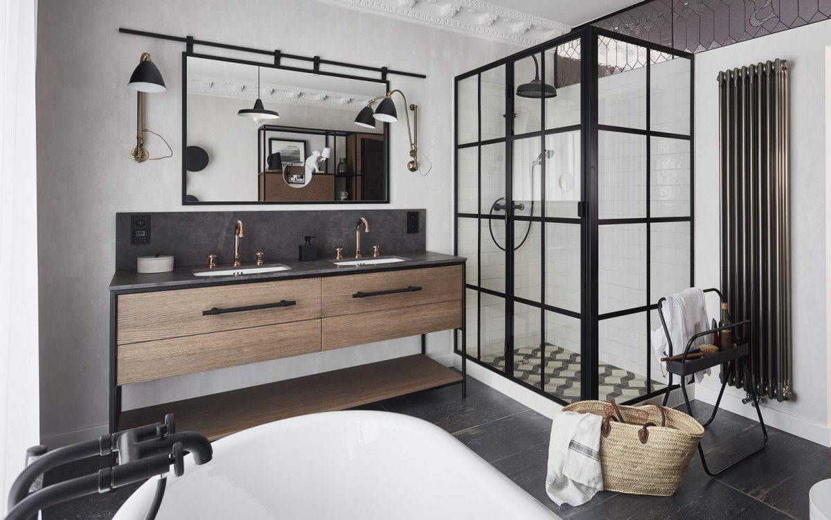 Таким образом, была создана ванная комната, в которой промышленное остекление душа сочетается с элегантной золотой фурнитурой, используемой в умывальнике, так что прочный черный кран снова появляется рядом с элегантной отдельно стоящей ванной, которая является центральным местом проекта.