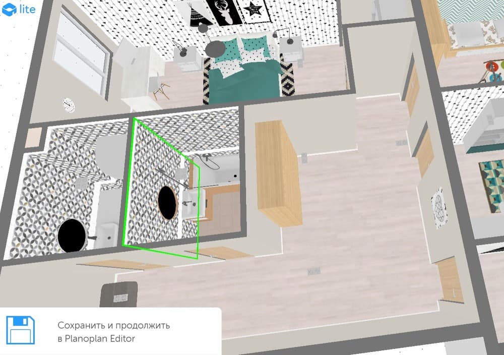 Простенький 3D-планировщик онлайн без возможности скачивания. Можно загрузить детали. Русскоязычная и лёгкая для понимания разработка. Интерьер ванной комнаты можно подобрать за 30—40 минут даже новичку. Минус в том, что для использования предоставлен ограниченный ассортимент предметов. Если выбранной мебели и плитки нет в онлайн-каталоге, придётся заменить их другими.