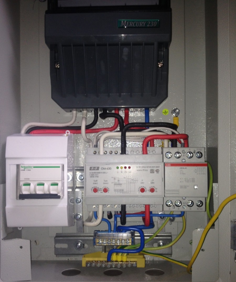 В соответствии со схемой, подсоединяется контактор, переключающий напряжение на электрооборудование. Далее происходит настройка ограничителя. Сначала настраивается мощность отключения. Потом выставляется промежуток времени производства ограничителя в перегруженном положении. В последнюю очередь устанавливается время возвращения прибора в первоначальное состояние.