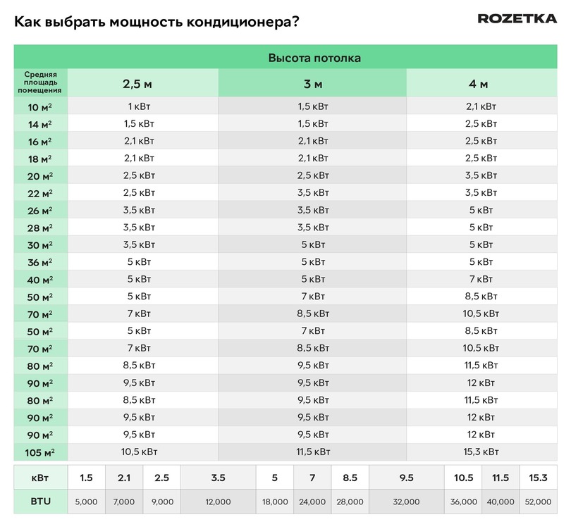 Во-первых, следует обратить внимание на мощность кондиционера. Расчет мощности проводится исходя из площади помещения, которое требуется охладить
