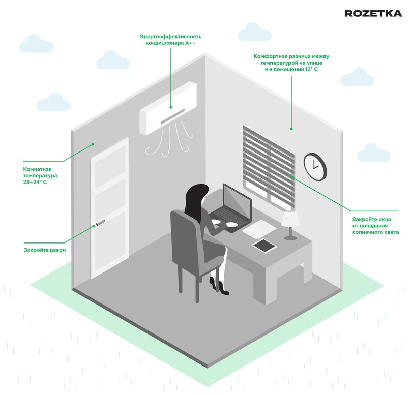 Важно помнить, что комфортная температура для человека летом 23-24 °C, а перепад между температурой воздуха на улице и в помещении не должен превышать 12 °C. Не забывайте регулярно делать профилактику кондиционера – замену и очищение фильтров, обновление охлаждающей жидкости – прибор будет работать эффективнее, а срок службы увеличится. Также не стоит держать кондиционер постоянно включенным. Лучше настроить периодическую работу устройства при помощи встроенного таймера или использовать умную розетку. Если вы пользуетесь кондиционером ночью, применяйте сберегающий или тихий режим работы, а двухзонный счетчик электроэнергии поможет платить в два раза меньше за электроэнергию в период с 23:00 до 7:00.