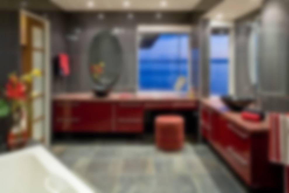 Вариант № 1. Контрасты – основа современного интерьера: сочетание красного и черного, белого и черного, ярких тонов с нейтральными стало базой в дизайне ванной комнаты в стиле минимализм, хай-тек, арт-деко. Контрастное сочетание выполняет декоративную функцию.