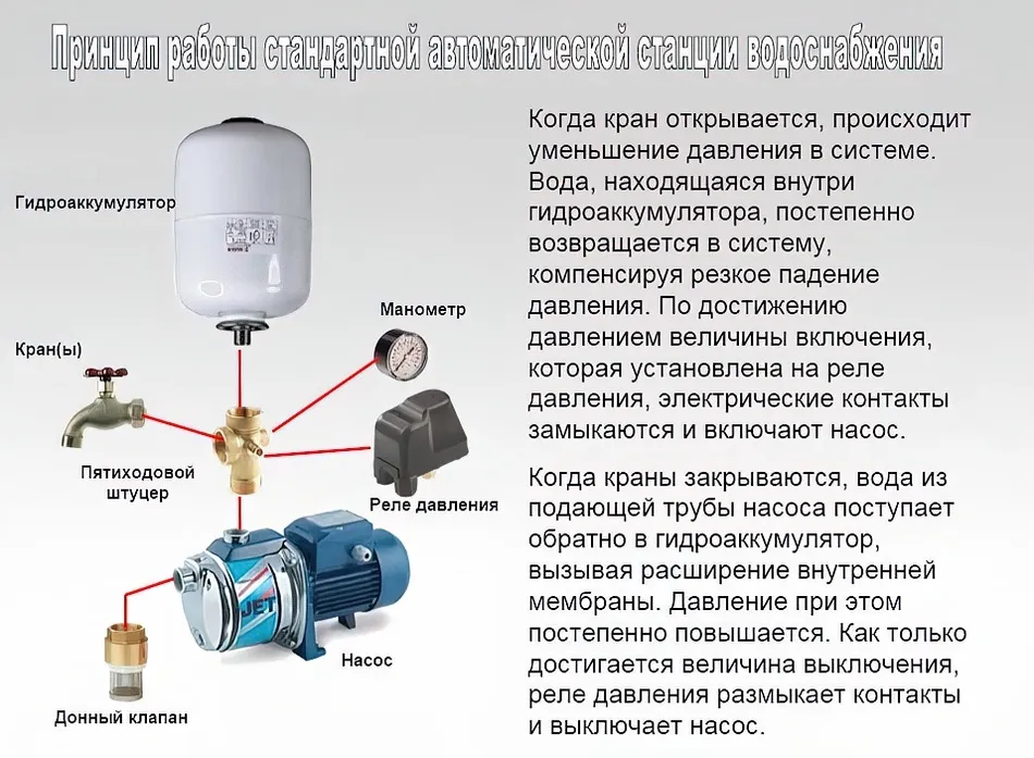 Регулировка давления выполняется с помощью гидроаккумулятора. Благодаря этому элементу системы снижается частота включений и отключений насоса. Гидроаккумулятор представляет собой накопительный бак, создающий необходимое давление благодаря силе упругости воздуха. Совместная работа насосного агрегата и гидроаккумулятора регулируется при помощи реле. При существенном падении давления реле включает насос.