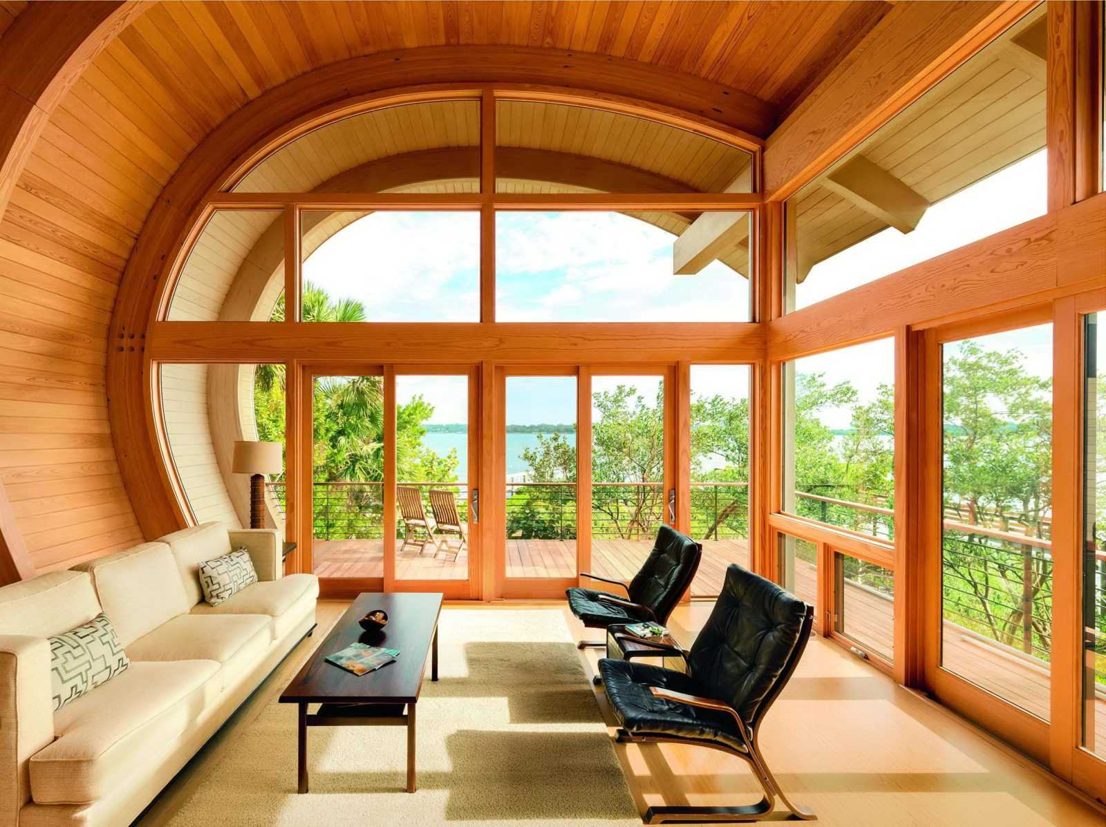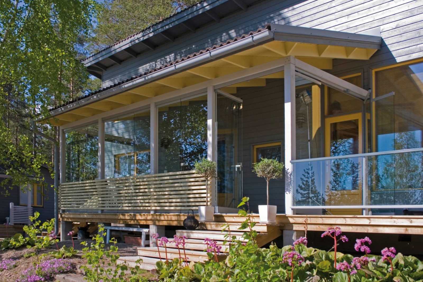 Существует еще один способ остеклить веранду — панорамные окна. Они позволяют наслаждаться природой без ограничений, так как три из четырех стен представляют собой полностью прозрачные конструкции.
