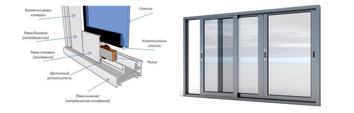 Это алюминиевые конструкции, в которых створки двигаются по полозьям, как в шкафах купе, а стыки створок герметизируются щёточным уплотнением.