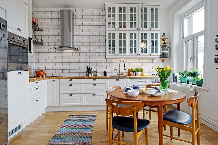 Для освещения обеденного стола могут использоваться люстра, настенные бра и потолочные лампы. Немаловажную роль на кухне играет декоративная подсветка, которая монтируется внутри шкафов, вдоль потолка, плинтуса, низа и верха кухонного гарнитура.