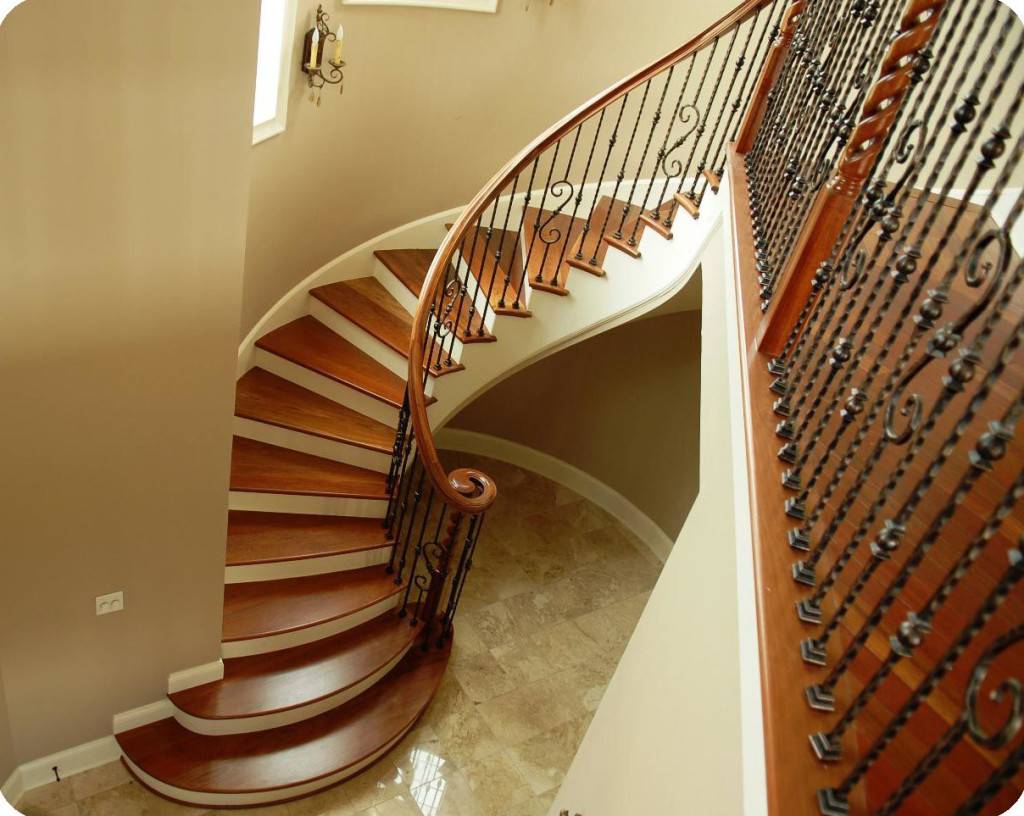 В моде также лестницы с коваными перилами и балясинами. Витое литье придает изящество и воздушность, особенно если это винтовая конструкция.