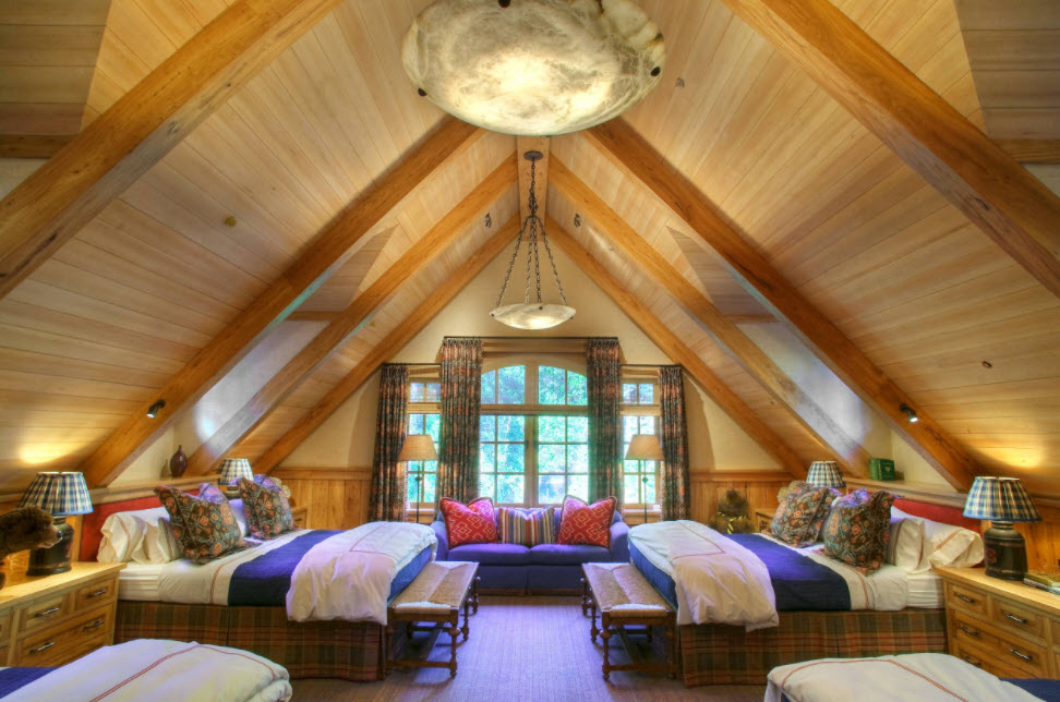На фото варианты обустройства мансарды в деревянном доме с ломаной крышей: