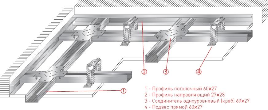 Каркас потолка еще не готов, ведь ему не хватает жесткости. С этой целью устанавливаются перемычки (шаг 60 см), между только что зафиксированными профилями. Для большего удобства можно воспользоваться специальными кронштейнами крабами, к которым будут крепиться заранее нарезанные перемычки. Если не хочется терпеть дополнительных растрат, то можно пойти иным способом.