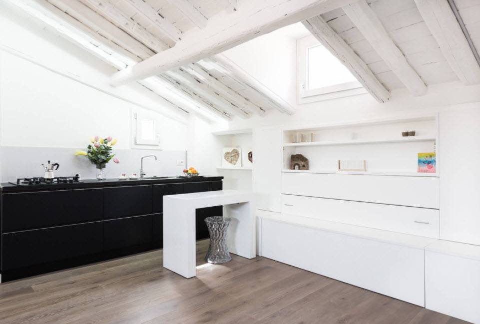 Для небольшой мансарды лучше выбирать комбинированную отделку, при которой лестница и перегородки будут выполнены из дерева, а стены покрыты декоративной штукатуркой или оклеены обоями белого цвета.