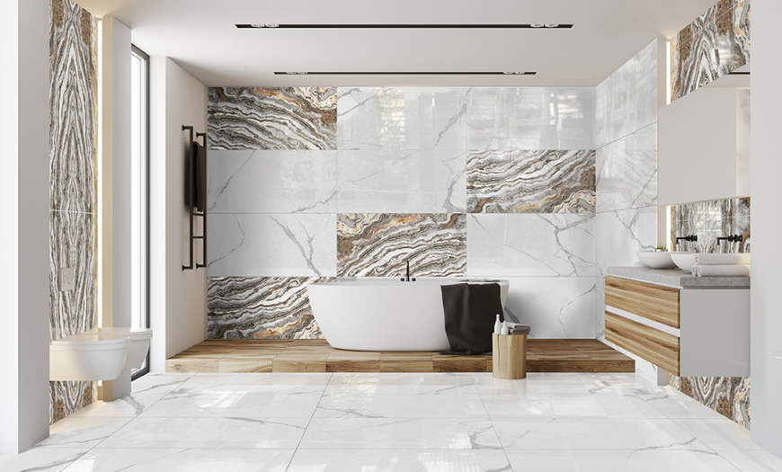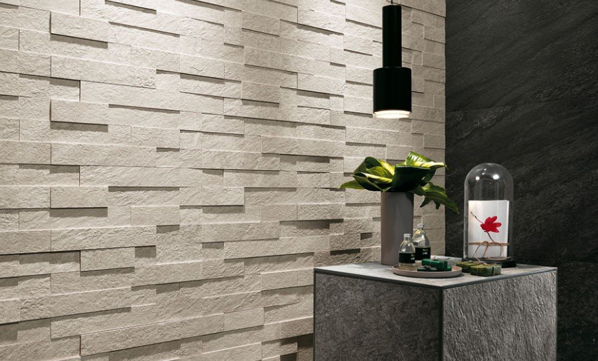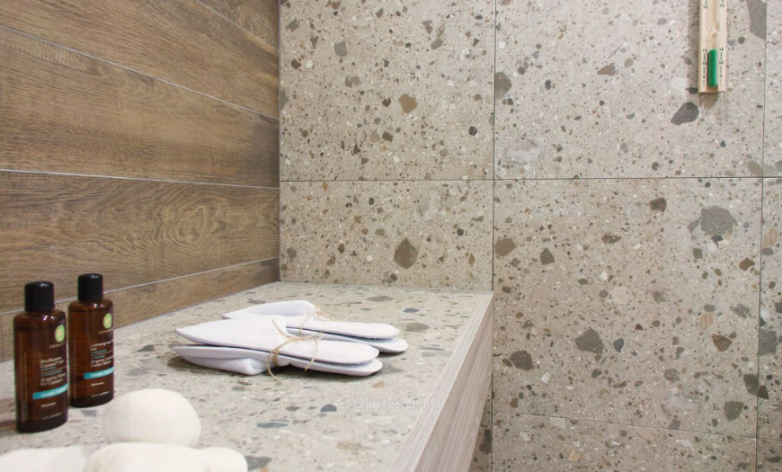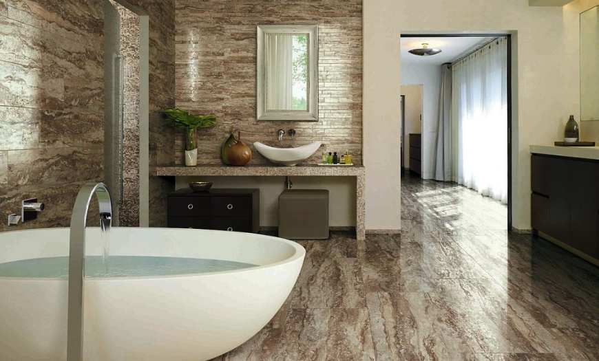 Дизайнеры широко используют материал, имитирующий такие натуральные камни как оникс (с контрастными прожилками, разными узорами, серым или песочным оттенком), травертин (серый, коричневый). Также модный дизайн получается с кафелем под сланец или гранит.