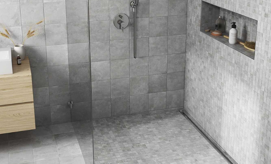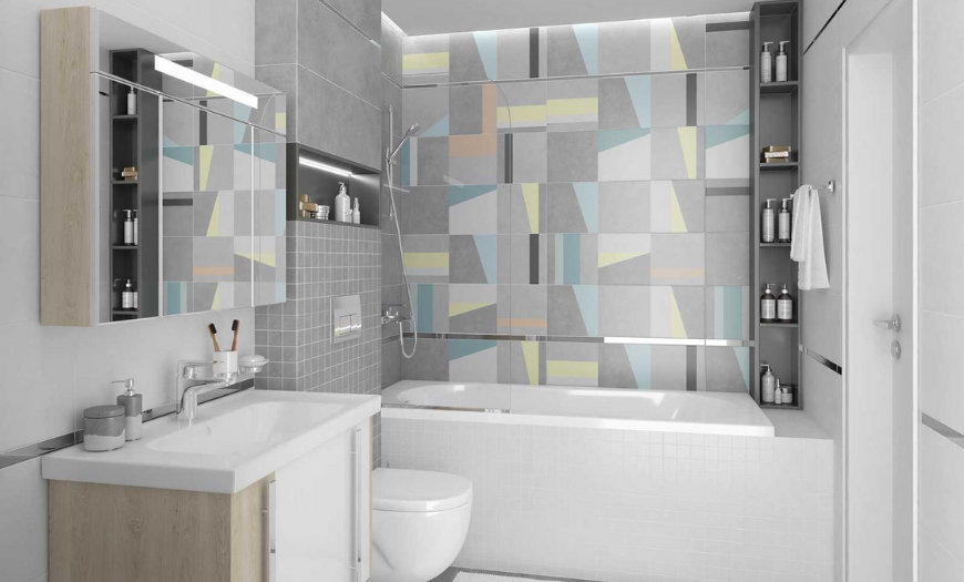 Облицовка плиткой с цементным эффектом создает ощущение простора, выглядит свежо, аккуратно. Одинаково хорошо подходит для стен и пола ванной комнаты.