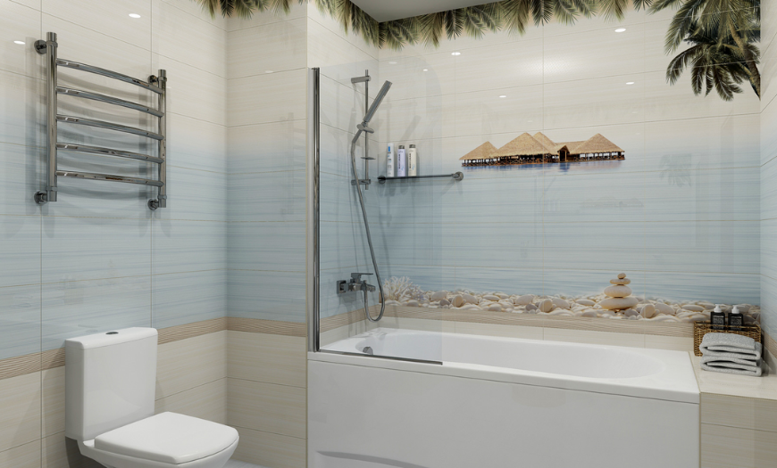 Она прекрасно сочетается с другими отделочными материалами, например, плиткой или обоями. А чтобы придать ванной целостности, дизайнеры рекомендуют основные цвета и мотивы на изображении поддерживать различными элементами декора – полотенцами, ковриками, мыльницами и т.д.